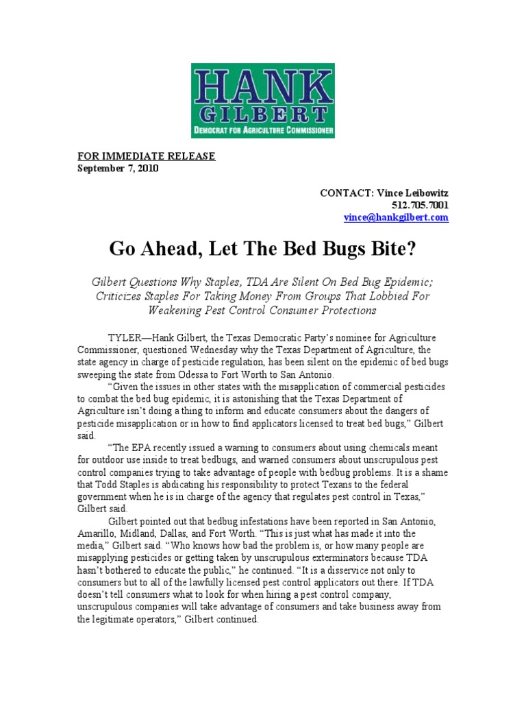 Hank Gilbert, the Texas Democratic Party's nominee for Agriculture Commissioner, questioned Wednesday why the Texas Department of Agriculture, the state agency in charge of pesticide regulation, has been silent on the epidemic of bed bugs sweeping the state from Odessa to Fort Worth to San Antonio.