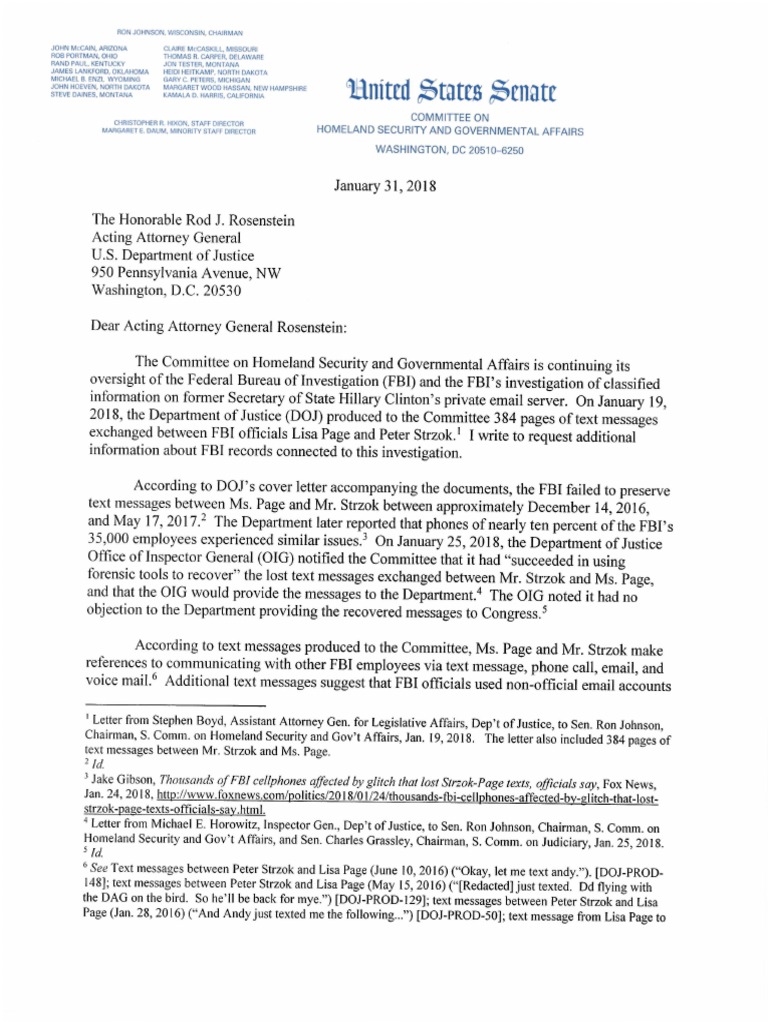 Chairman, S. Comm. on Homeland Security and Gov't Affairs, Jan. 19, 2018.‘The Honorable Rod Rosenstein
