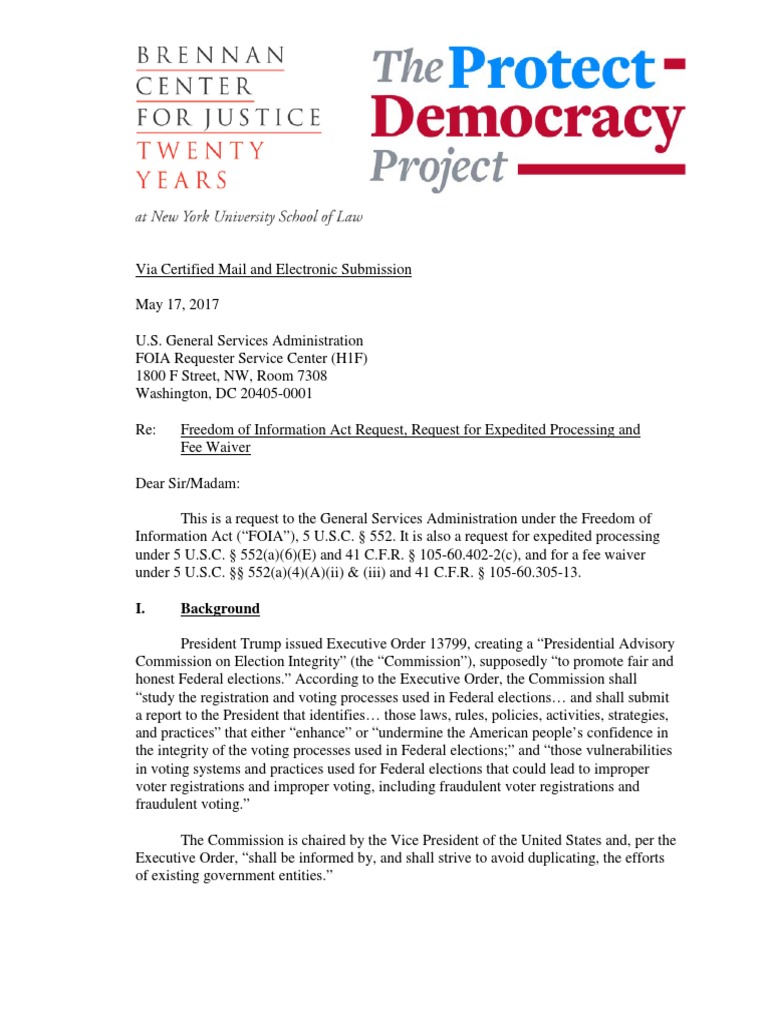 regarding a fee waiver, the Brennan Center and The Protect Democracy Project intend to