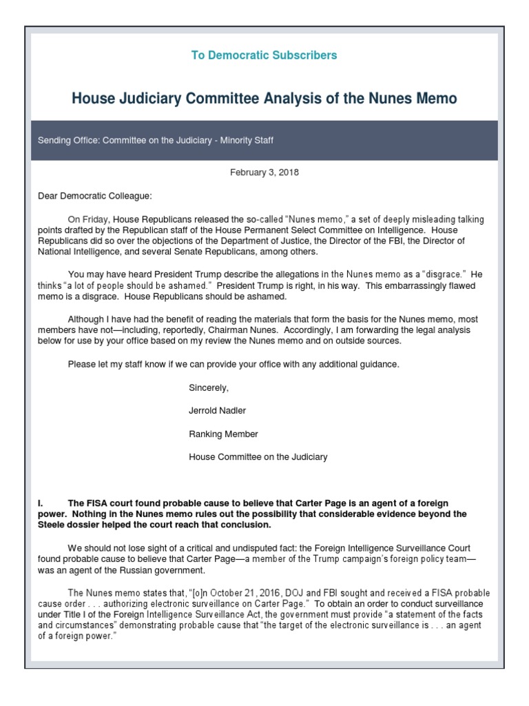 points drafted by the Republican staff of the House Permanent Select Committee on Intelligence. House Republicans did so over the objections of the Department of Justice, the Director of the FBI, the Director of National Intelligence, and several Senate Republicans, among others.