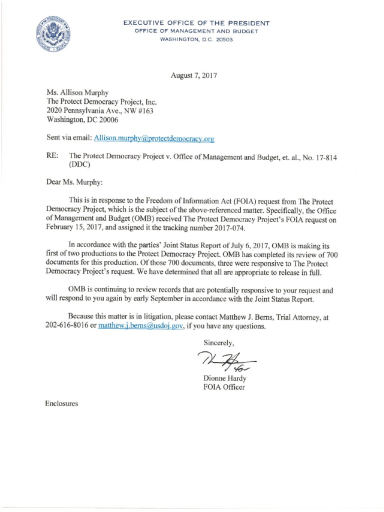 On February 15, 2017, Protect Democracy sent FOIA requests to the Office of Management and Budget (OMB) and the Office of Legal Counsel (OLC) at the Department of Justice (OLC) to learn whether this Administration sought any legal or other agency review of its Executive Order, Protecting the Nation from Foreign Terrorist Entry Into the United States, EO 13769. Protect Democracy had to go to court to force a response, and the government is in the process of sending its responsive records. See The Protect Democracy Project v. Office of Mgmt. and Budget, U.S. Dep't of Justice, 1:17-cv-814/815-TJK (D.D.C. May 5, 2017). OMB found only one record showing review of the executive order, and OLC did only an abbreviated "form and legality review."