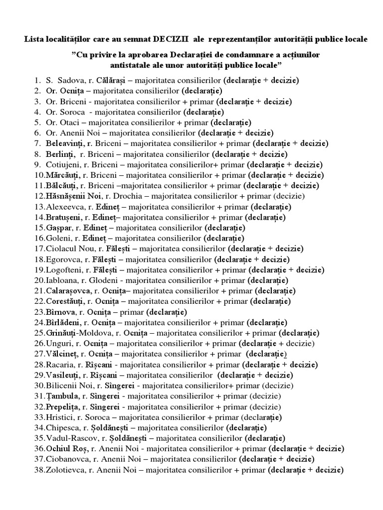 7. Beleavinți, r. Briceni – majoritatea consilierilor + primar (declarație + decizie)