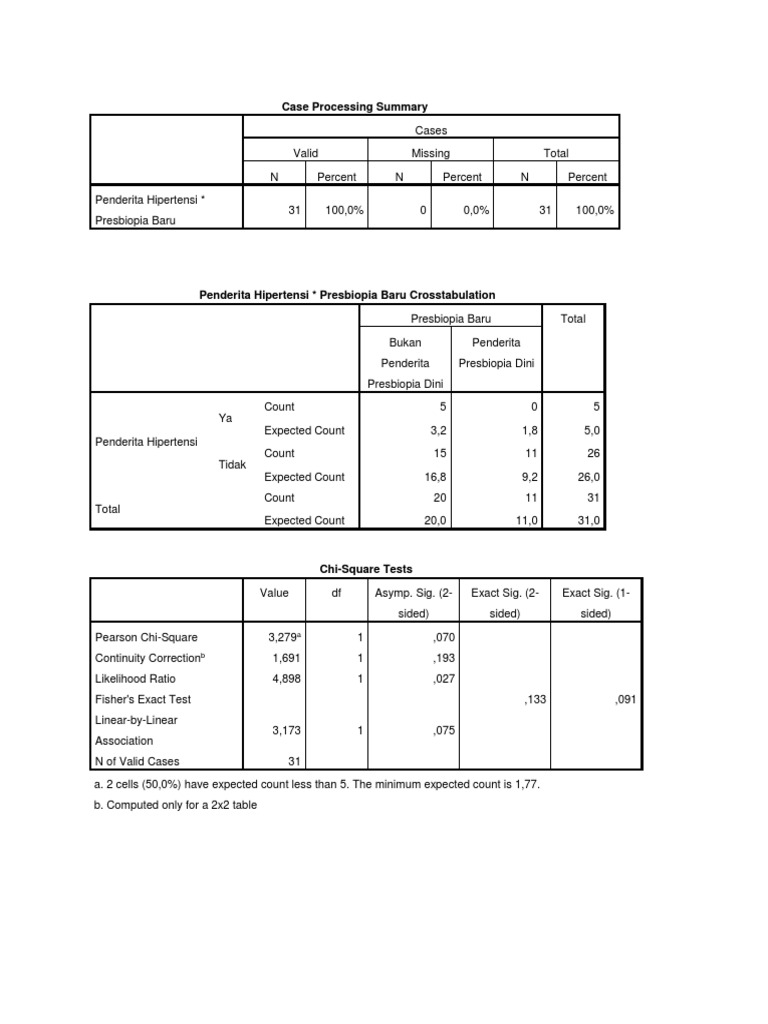a. 2 cells (50,0%) have expected count less than 5. The minimum expected count is 1,77.