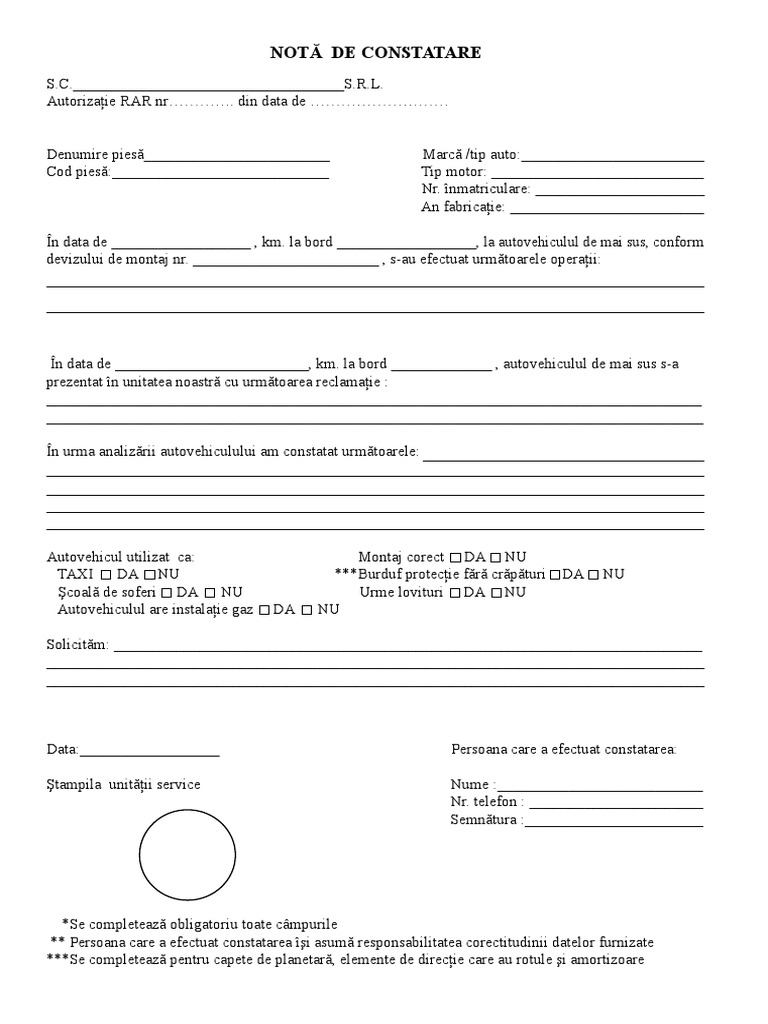 În data de __________________ , km. la bord __________________, la autovehiculul de mai sus, conform