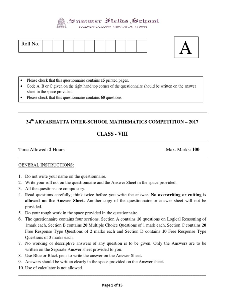 34th ARYABHATTA INTER-SCHOOL MATHEMATICS COMPETITION – 2017