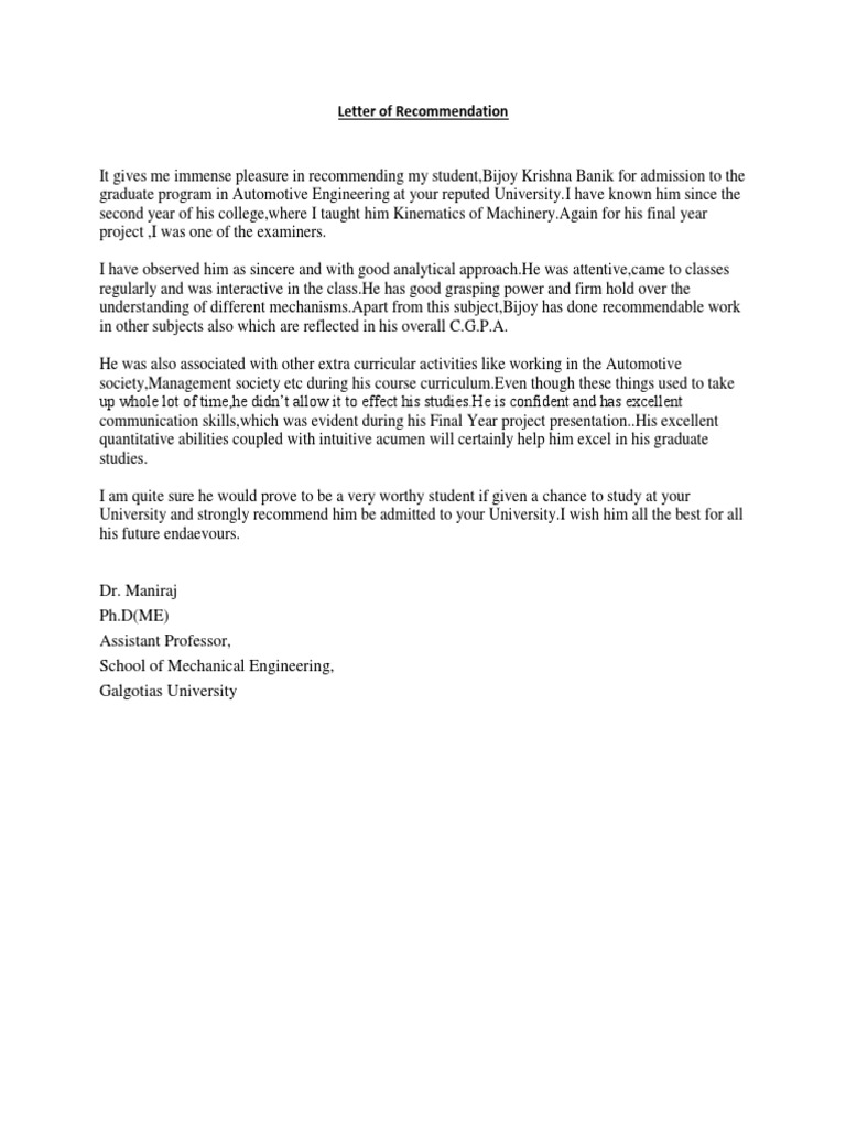 It gives me immense pleasure in recommending my student,Bijoy Krishna Banik for admission to the