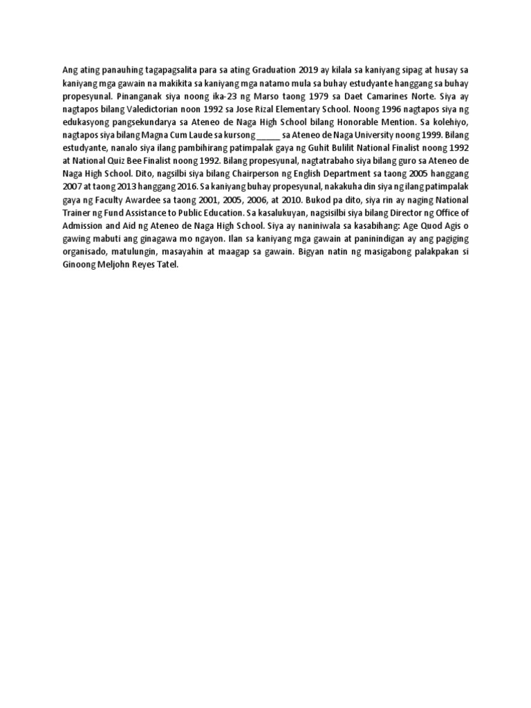 Admission and Aid ng Ateneo de Naga High School. Siya ay naniniwala sa kasabihang: Age Quod Agis o