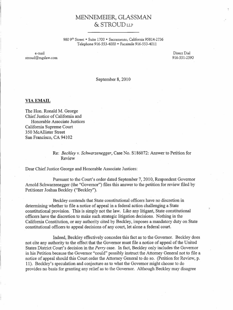 From California Supreme Court: Gov Schwarzenegger's Response to Pacific Justice Institute's Petition for review of Appellate Court denial. Beckley v Schwarzenegger. Filed 9/8/2010 NOTE: PJI's Petition DENIED by California Supreme Court on 9/8/2010