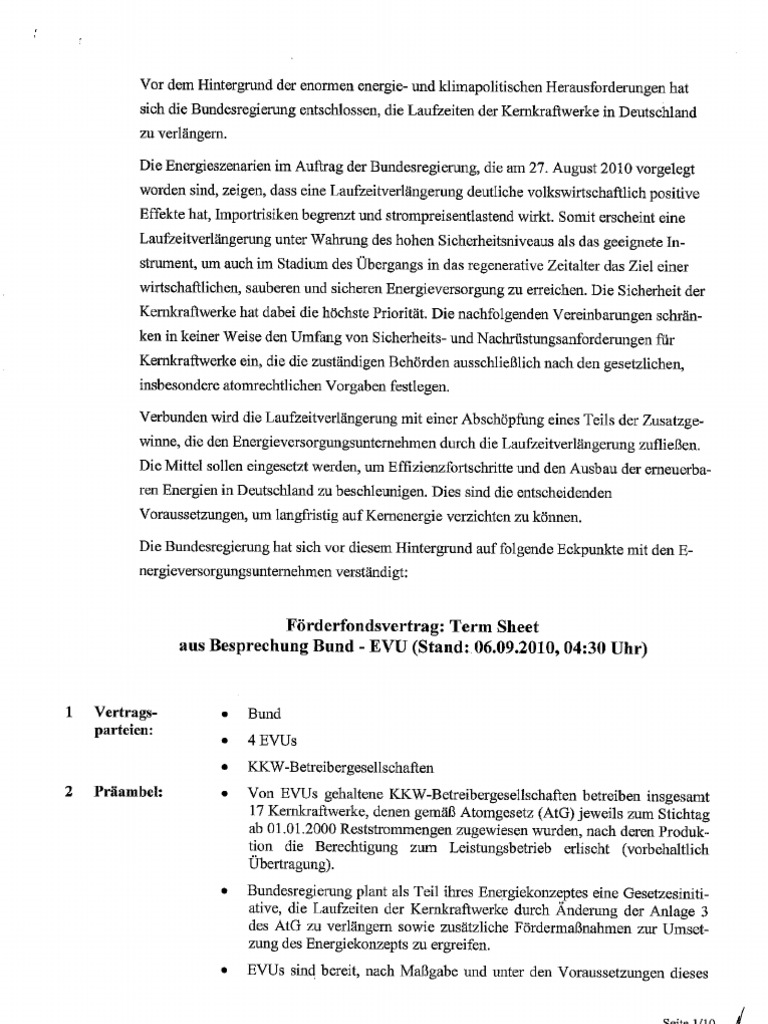 In diesem (zunächst geheim gehaltenen) Vertrag haben die schwarz-gelbe Bundesregierung und die vier großen Energiekonzerne Eon, RWE, EnBW und Vattenfall am 06.09.2010 die Konditionen zum Aus…