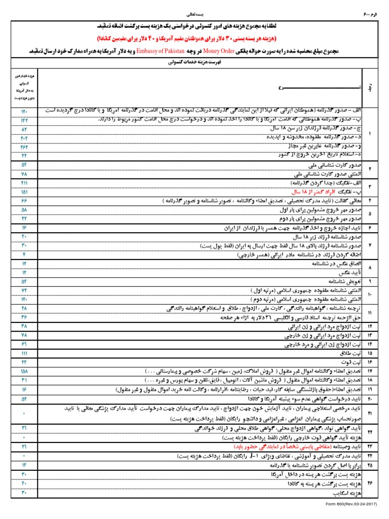 فهرست هزینه خدمات کنسولی