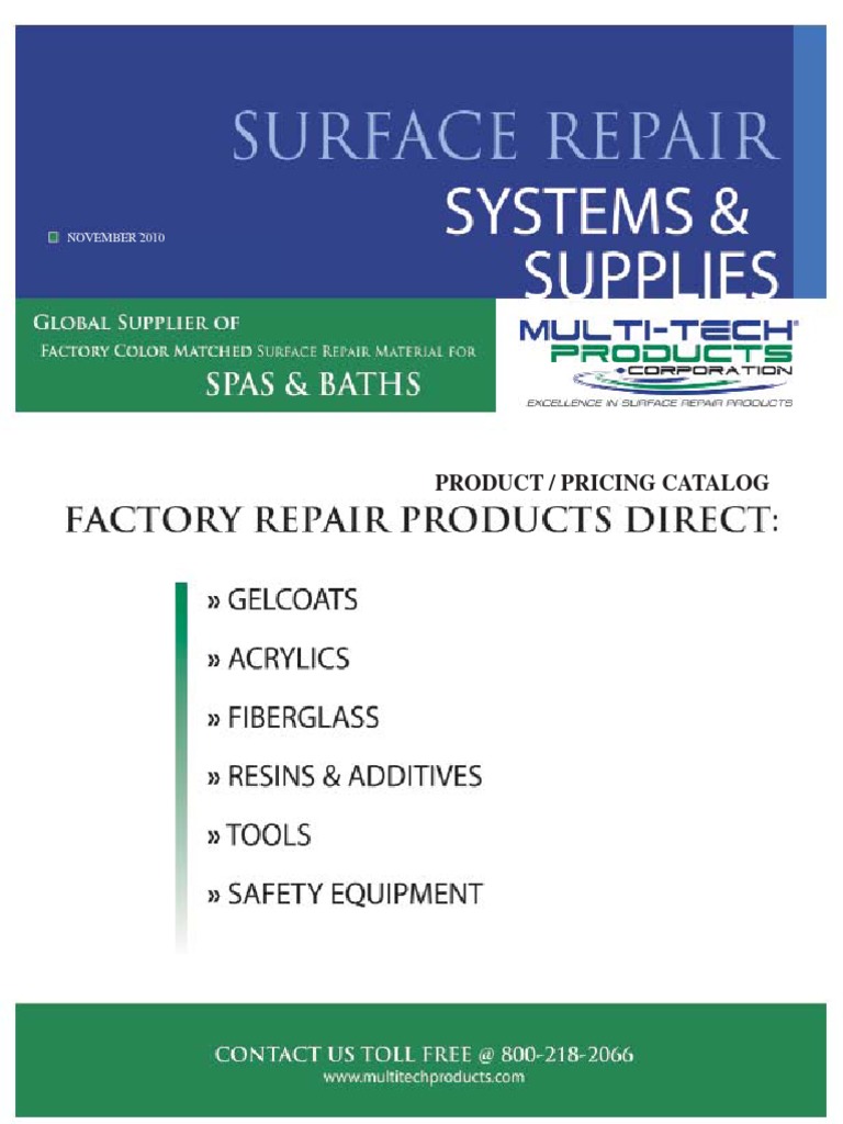 MTP sells products to repair minor scratches, blisters, and cracks, and to completely refinish spas and
