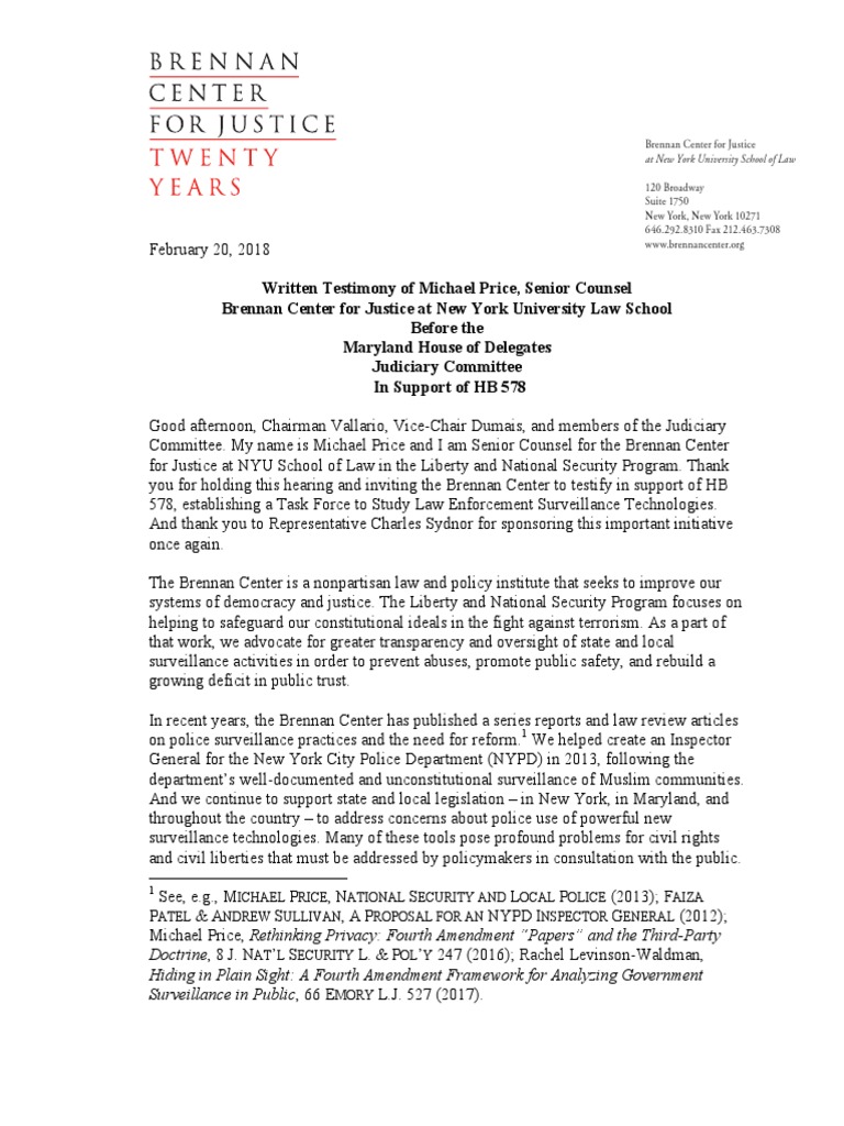 Committee. My name is Michael Price and I am Senior Counsel for the Brennan Center