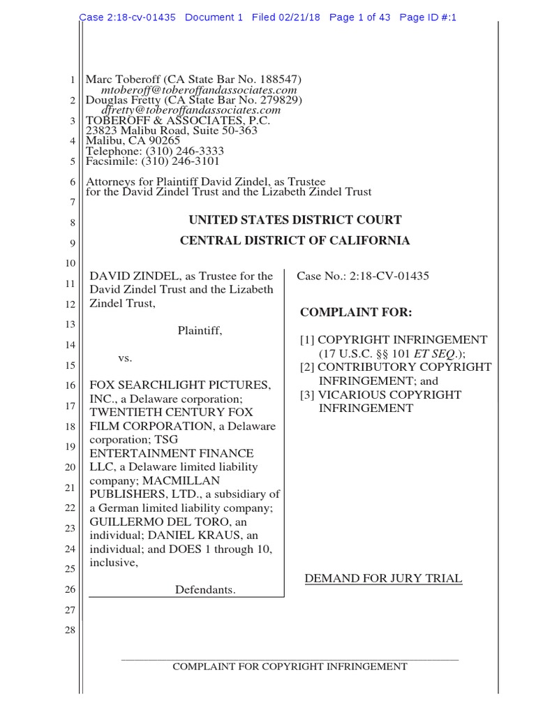DAVID ZINDEL, as Trustee for the David Zindel Trust and the Lizabeth Zindel Trust, Plaintiff, vs.FOX SEARCHLIGHT PICTURES, INC., a Delaware corporation; TWENTIETH CENTURY FOX FILM CORPORATION, a Delaware corporation; TSG ENTERTAINMENT FINANCE LLC, a Delaware limited liability company; MACMILLAN PUBLISHERS, LTD., a subsidiary of a German limited liability company; GUILLERMO DEL TORO,an individual; DANIEL KRAUS, an individual;and DOES 1through 10,inclusive, Defendants.Case No.:2:18-CV-01435