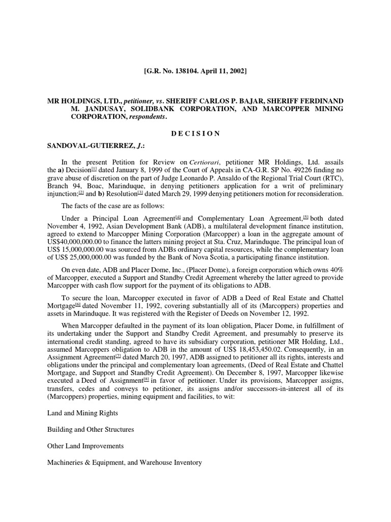To secure the loan, Marcopper executed in favor of ADB a Deed of Real Estate and Chattel