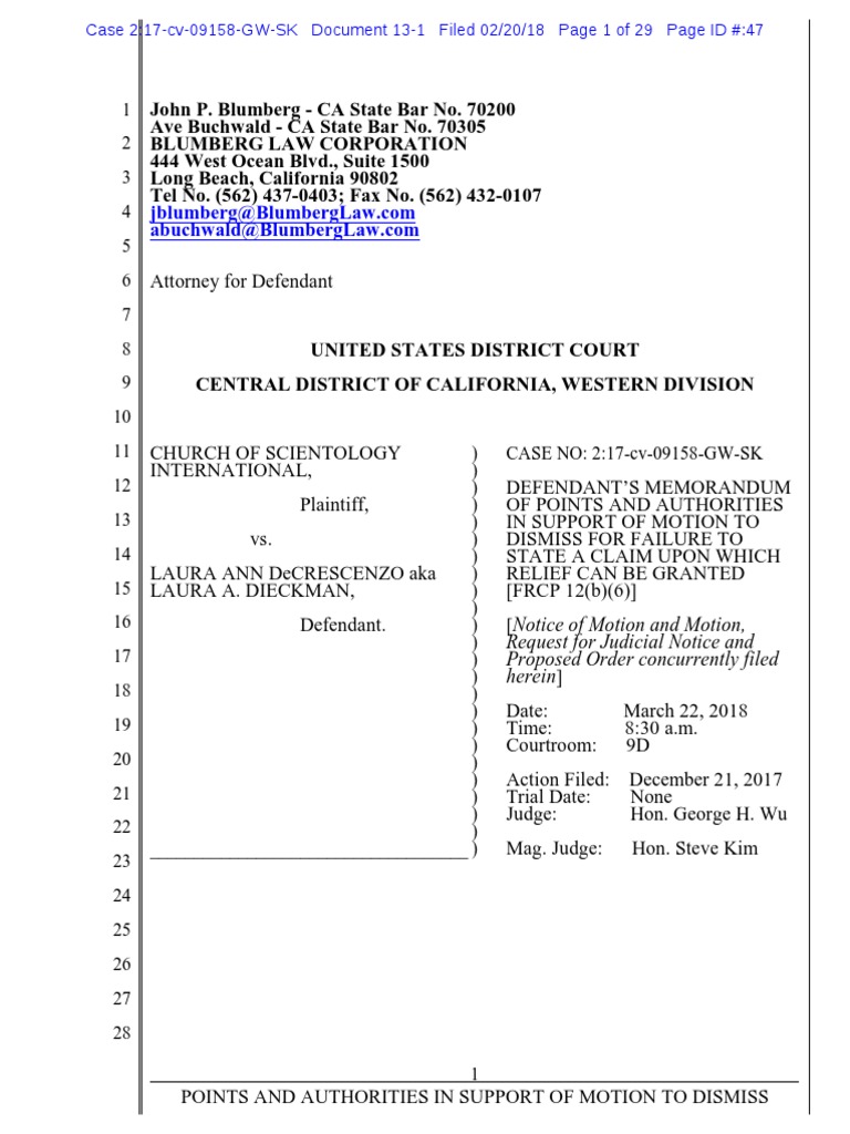 CHURCH OF SCIENTOLOGYINTERNATIONAL,Plaintiff,vs.LAURA ANN DeCRESCENZO akaLAURA A. DIECKMAN,Defendant.