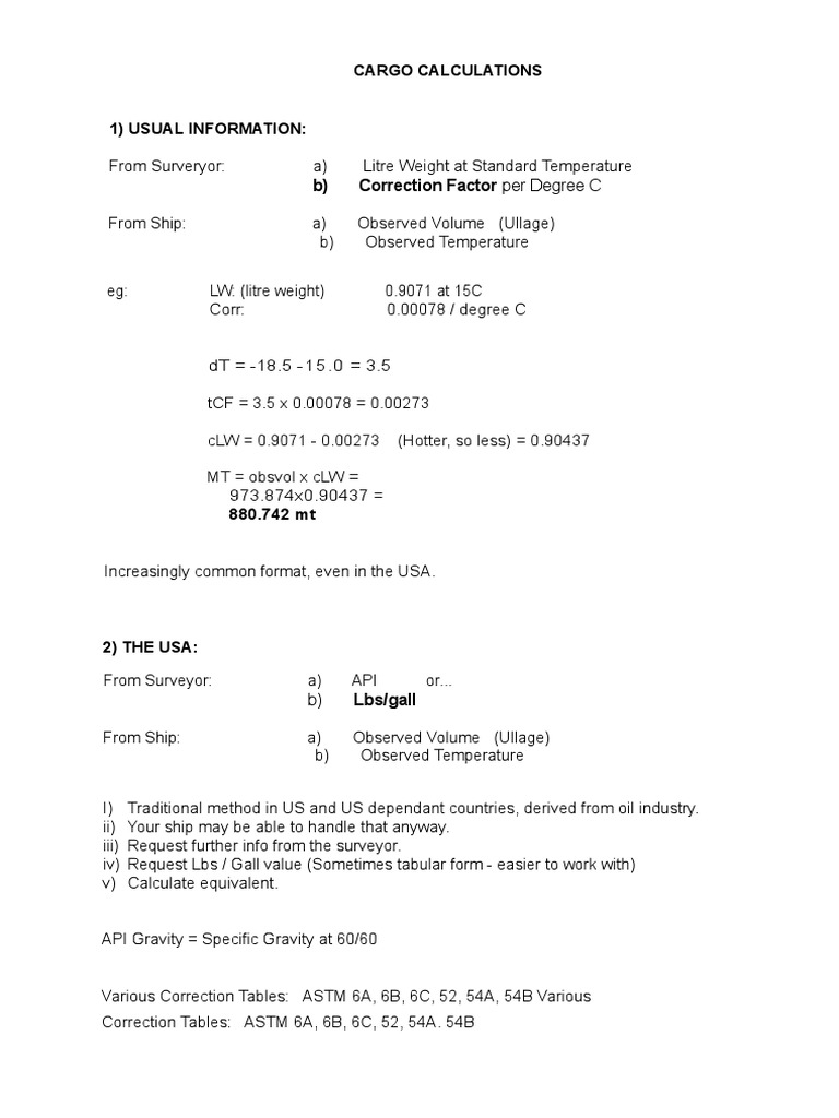 iii) Important to use same method on load and discharge. Surveyor may use his own, or a