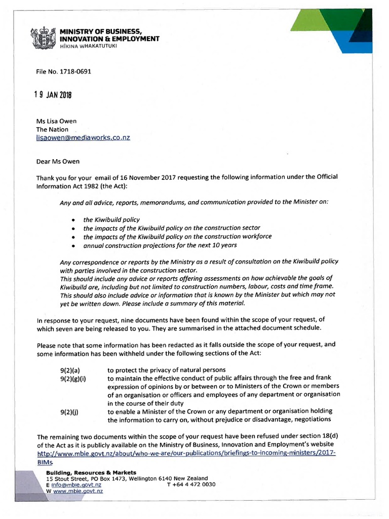 | MINISTRY OF BUSINESS, INOVATION & EMPLOYMENT HIKINA WHAKATUTUKI File No. 1718-0691 19 JAN 2018 Ms Lisa Owen The Nation lisaowen@mediaworks.co.nz Dear Ms Owen Thank you for your email of 16 November 2017 requesting the following information under the Official Information Act 1982 (the Act): Any and all advice, reports, memorandums, and communication provided to the Minister on: the Kiwibuild policy the impacts of the Kiwibuild policy on the construction sector the impacts of the Kiwibuild policy on the construction workforce annual construction projections for the next 10 years ‘Any correspondence or reports by the Ministry as a result of consultation on the Kiwibuild policy with parties involved in the construction sector. This should include any advice or reports offering assessments on how achievable the goals of Kiwibuild are, including but not limited to construction numbers, labour, costs and time frame. This should also include advice or information that is known by the Minister but which may not yet be written down. Please include a summary of this material. In response to your request, nine documents have been found within the scope of your request, of which seven are being released to you. They are summarised in the attached document schedule. Please note that some information has been redacted as it falls outside the scope of your request, and some information has been withheld under the following sections of the Act: 9(2)(a) to protect the privacy of natural persons 92yte(i) ‘to maintain the effective conduct of public affairs through the free and frank expression of opinions by or between or to Ministers of the Crown or members of an organisation or officers and employees of any department or organisation in the course of their duty 9124) to enable a Minister of the Crown or any department or organisation holding, the information to carry on, without prejudice or disadvantage, negotiations The remaining two documents within the scope of your request have been refused under section 18(d) of the Act as it is publicly available on the Ministry of Business, Innovation and Employment’s website http://www.mbie,govt.nz/about/who-we-are/our- publications/briefings-to-incoming-ministers/2017- BIMs Bullding, Resources. Markets 15 Stout Street, PO Box 1473, Wellington 6140 New Zealand E info@mbie.qovt.nz T #64 4 472.0030 W wun.mbie.covt.nz In terms of section 9(1) of the Act, | am satisfied that, in the circumstances, the decision to withhold information under section 9 of the Act is not outweighed by other considerations that render it desirable to make the information available in the public interest. You have the right to seek an investigation and review of my decision by the Ombudsman, in accordance with section 28(3) of the Act. The relevant details are: The Ombudsman Office of the Ombudsman PO Box 10152 WELLINGTON 6143 0800 802 602 www.ombudsman.parliament.nz Yours sincerely Murray Nash Manager, KiwiBuild Establishment Housing and Urban Branch 1 | 1 November 2017 | Briefing: Capacity of the construction sector to undertake —_| 9(2)(a) Kiwibuild 2 | 1 November 2017 | Briefing: Implementing KiwiBuild (2a) . 9(2\(8)()) 3 | 6 November 2017 | Briefing: Leveraging and enhancing the existing Crown Land | 9(2)(a) Development Programme to contribute to KiwiBuil 7 9(2)0) objectives ‘4 [i3November | Briefing: Stocktake of Auckland housing developments ‘9(2)a) 2017 5 | 16November | Briefing: Legislation to establish a national urban 9(2\(a) 2017 development authority and empower complex development projects 6 | 16November | Email: Oral PQ KiwiBuild 9(2)(a) 2017 7 Slide Pack: Housing presentation for 11.30am 20 November 2017 meeting Document Being Withheld 8 | 25 October 2017 | Briefing to Incoming Minister, 18(d) 9 Slide Pack: Housing — Delivering your housing programme | 18(d) MINISTRY OF BUSINESS, INNOVATION & EMPLOYMENT HIKINA WHAKATUTUKI BRIEFING Capacity of the construction sector to undertake Kiwibuild Date: 1 November 2017 Priority: Urgent Security In Confidence Tracking 06451718 classification: numb [Actions sought a : Hon Phil Twyford Note the conclusions of this wo the inoreasing/ Minister of Housing and Urban demand for construction ocoupations, and the potential \ Development shortfalls in the enkenel key'skill. . Note thet ofcials il provide you with more ted advice later dex noe set of options to ar ‘develop | ie A worktor ue ‘other darker | footing a capt ns bffelina tb Your coleagues the A ie se Ea ter of Employment, the of Soci nt, and the Minister of Naigeton Hon Jenny Salesa Note this! Associate Minato rosso an | (¢ Urban Decconsth > So Contact for ive discussto I Position Telephone 4st contact ger, Construction & - Knee policy 1 04 896 5883 | $:9(2)(a) v — Senior Policy Advisor 04 896.5126 | Tra teng departments/agencies have been consulted on this paper | Tressuv, Ministry of Education, Tertiary Education Commission, Ministry of Social Development, ing New Zealand, Minister's office to complete: CO Approved (Declined O Noted C1 needs change Oseen DOvertaken by Events CO See Minister's Notes withdrawn ‘Comments MINISTRY OF BUSINESS, INNOVATION & EMPLOYMENT HIKINA WHAKATUTUKI BRIEFING Capacity of the construction sector to undertake Kiwibuild Date |} November 2017 ‘Security In Confidence sification: | Executive summary You have requested a initial analysis of the capacity of the construction sector to deliver the Kiwibuild programme, including the implications for the construction labour force. The residential construction sector appears to be reaching its capacity limits,'as indicated by plateauing levels of new dwelling consents, including in Auckland) /Most residential Building firtis are small and so have limited capacity to produce bespoke detached dwellings. The increased demand for construction labour is leading to the labour cost index for the sector trending significantly above the allindustres average... Recent surveys of the sector have