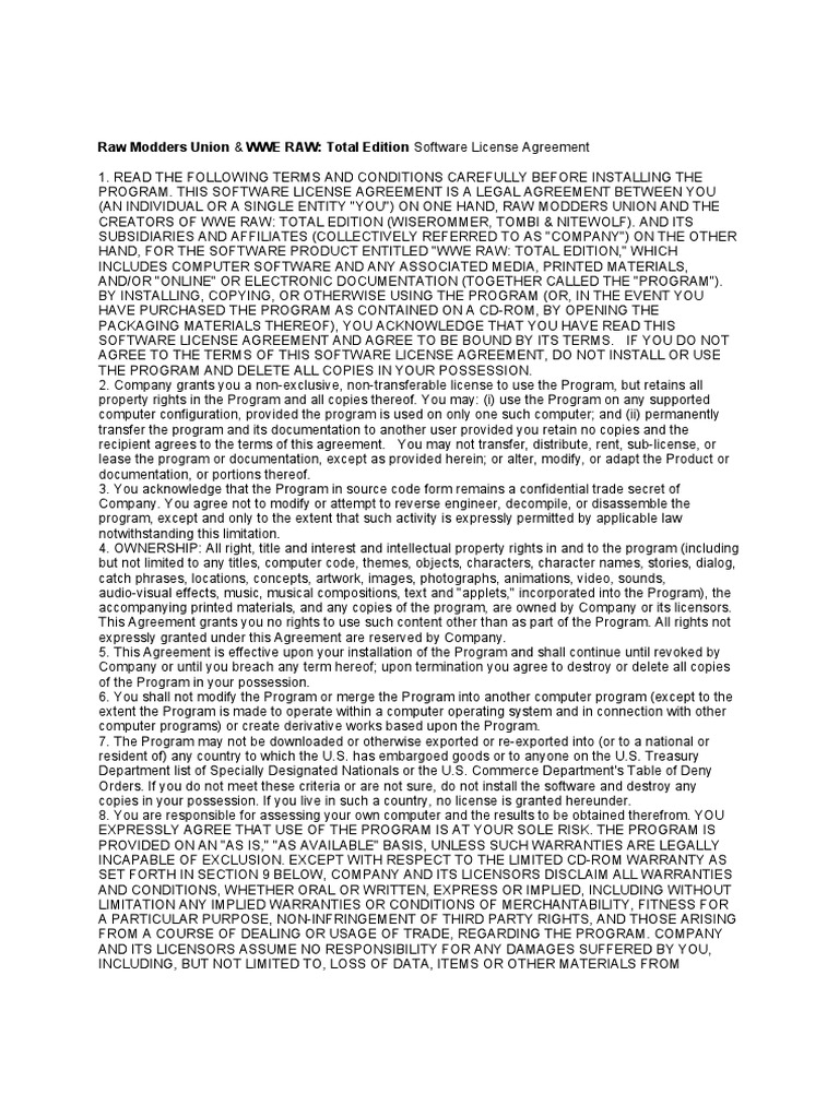 Raw Modders Union & WWE RAW: Total Edition Software License Agreement