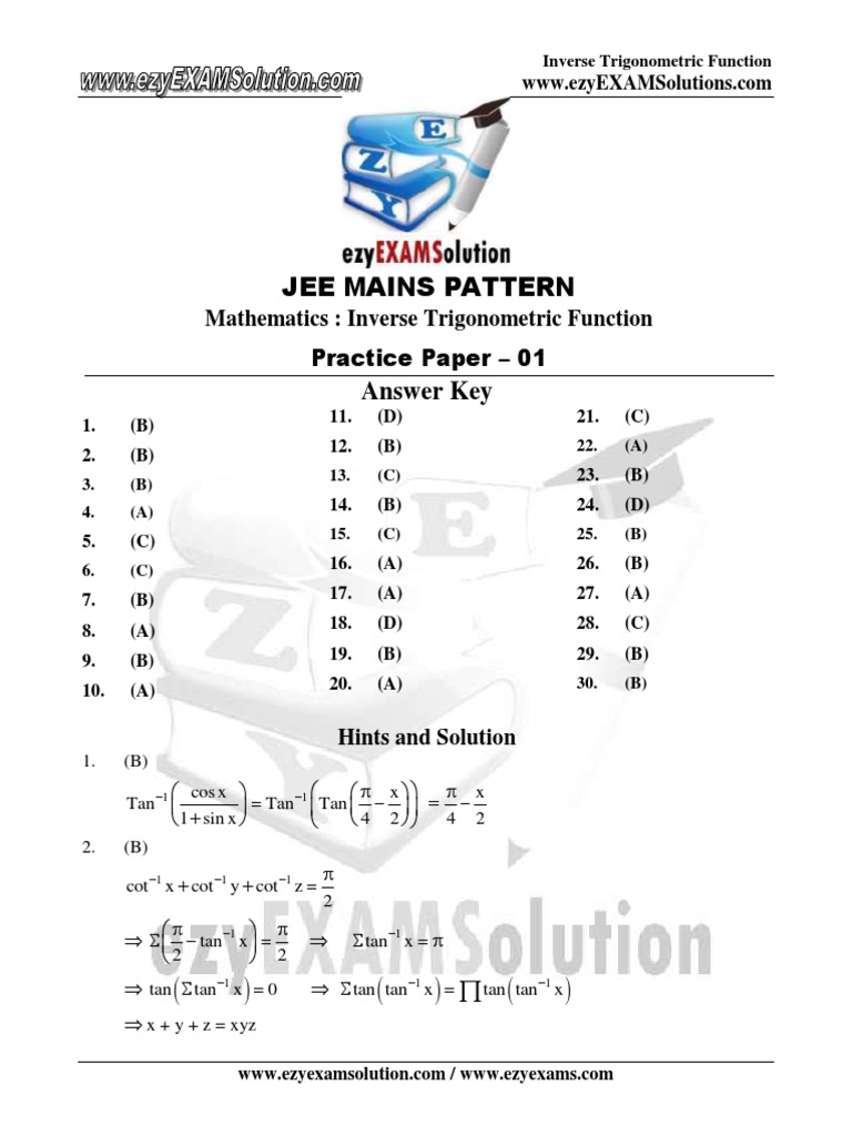 This document provides the questions, answers, and solutions for an inverse trigonometric functions practice test with 30 multiple choice questions. It includes the key for each question answer (A, B, C, etc.) as well as step-by-step working to explain the solutions. The summary focuses on providing the essential information about the document's content in 3 sentences or less.