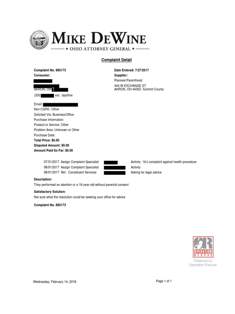 7/27/2017 complaint to the Ohio Attorney General's office regarding Planned Parenthood violating parental consent laws in Ohio.