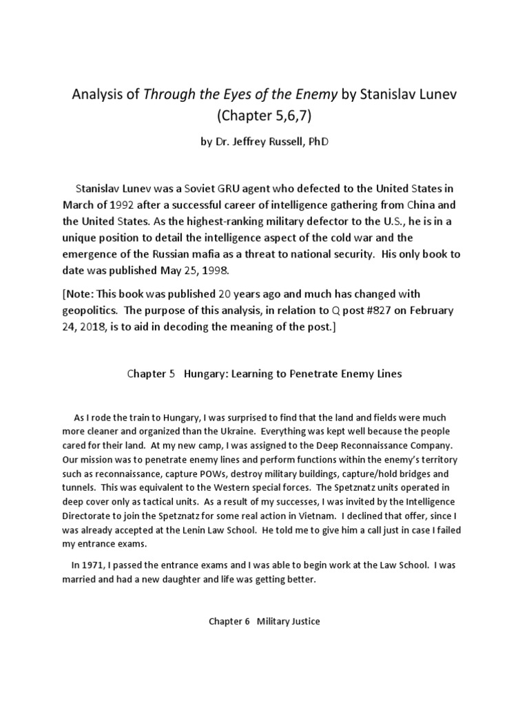 by Dr. Jeffrey Russell, PhD Stanislav Lunev was a Soviet GRU agent who defected to the United States in March of 1992 after a successful career of intelligence gathering from China and the United States. As the highest-ranking military defector to the U.S., he is in a unique position to detail the intelligence aspect of the cold war and the emergence of the Russian mafia as a threat to national security. His only book to date was published May 25, 1998. [Note: This book was published 20 years ago and much has changed with geopolitics. The purpose of this analysis, in relation to Q post #827 on February 24, 2018, is to aid in decoding the meaning of the post.] Chapter 5 Hungary: Learning to Penetrate Enemy Lines