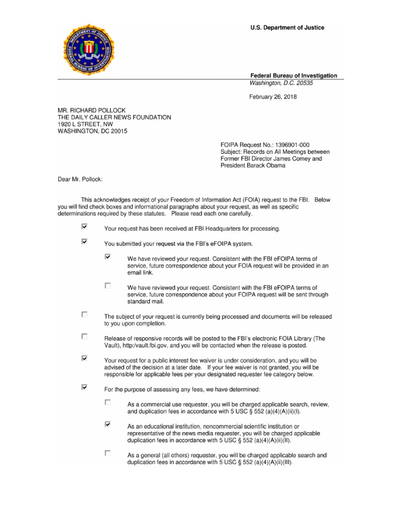 February 26, 2018 letter from the FBI to the Daily Caller News Foundation denying its request to expedite the process for releasing records pertaining to all meetings between former FBI Director James Comey and President Barack Obama.