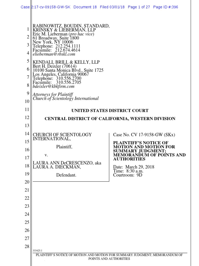 on March 29, 2018 at 8:30 a.m., or as soon thereafter as counsel may be heard, in the courtroom of the Honorable George H. Wu, United States District Judge, Central District of California, located in the United States Courthouse, 350 West First Street, Los Angeles, California 90012, Plaintiff Church of Scientology International (“CSI”) will and hereby does move pursuant to Rule 56 of the Federal Rules of Civil Procedure to grant summary judgment in its favor on CSI’s sole claim for declaratory and injunctive relief. This Motion is made upon the grounds that there is no genuine issue of material fact that a currently-pending action in California State Court against CSI, brought by Defendant Laura Ann DeCrescenzo (“LD”), is precluded as a matter of law due to a prior judgment of this Court, and therefore that CSI is entitled to a judgment as a matter of law on its claim for a declaration and injunction prohibiting LD from prosecuting her state court action. This Motion is based on this Notice of Motion, the Memorandum of Points and Authorities in support thereof, the Statement of Uncontroverted Facts and Conclusion of Law filed concurrently herewith, all of the pleadings, files, and records in this proceeding, all other matters of which the Court may take judicial notice, and any argument or evidence that may be presented to or considered by the Court prior to its ruling. This motion is made following the conference of counsel pursuant to Local Rule 7-3 which took place on February 22, 2018. DATED: March 1, 2018 Respectfully submitted, RABINOWITZ, BOUDIN, STANDARD, KRINSKY & LIEBERMAN, LLP By: /s/ Eric M. Lieberman Eric M. Lieberman Attorneys for Plaintiff Church of Scientology International