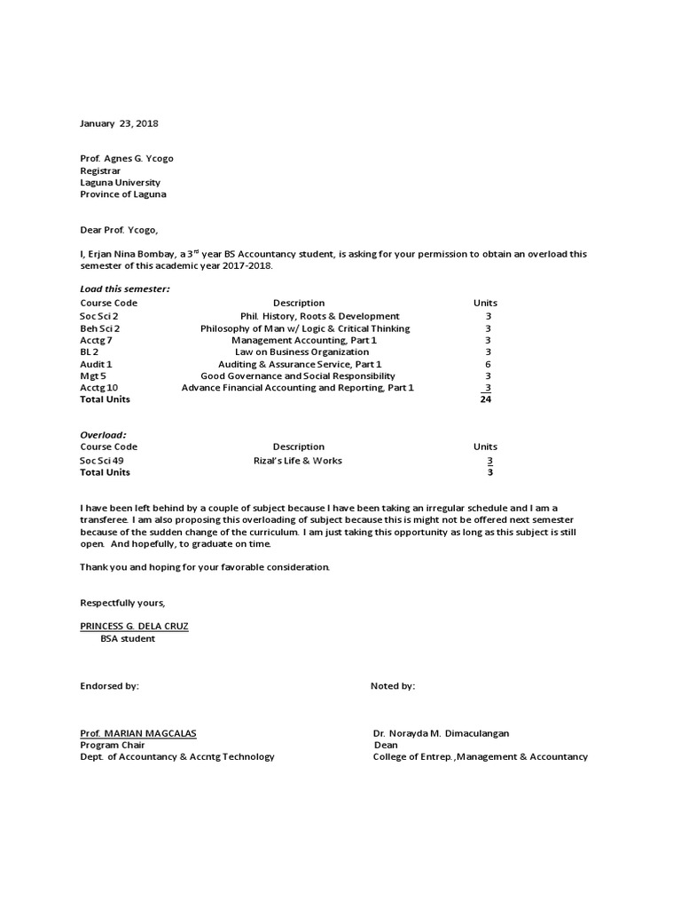 I, Erjan Nina Bombay, a 3rd year BS Accountancy student, is asking for your permission to obtain an overload this