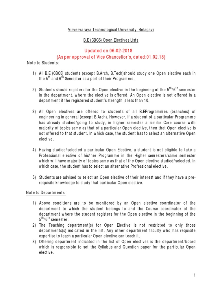 1) All B.E (CBCS) students (except B.Arch, B.Tech)should study one Open elective each in