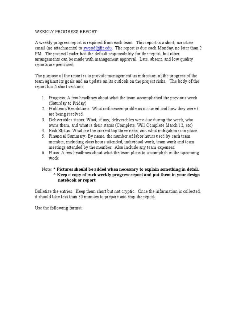 email (no attachments) to swood@fit.edu. The report is due each Monday, no later than 2