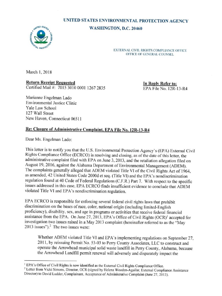 Letter from U.S. Environmental Protection Agency dismissing civil Rights complaints against Alabama Department of Environmental Management, dated March 1, 2018.