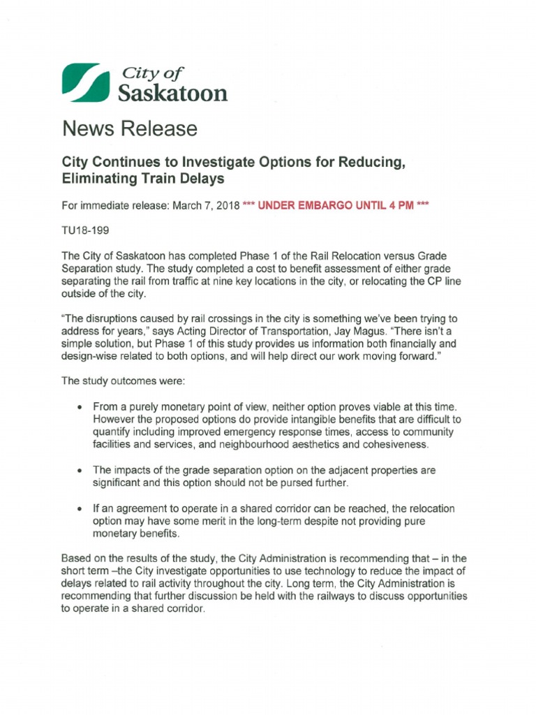 The City of Saskatoon has completed Phase 1 of the Rail Relocation versus Grade