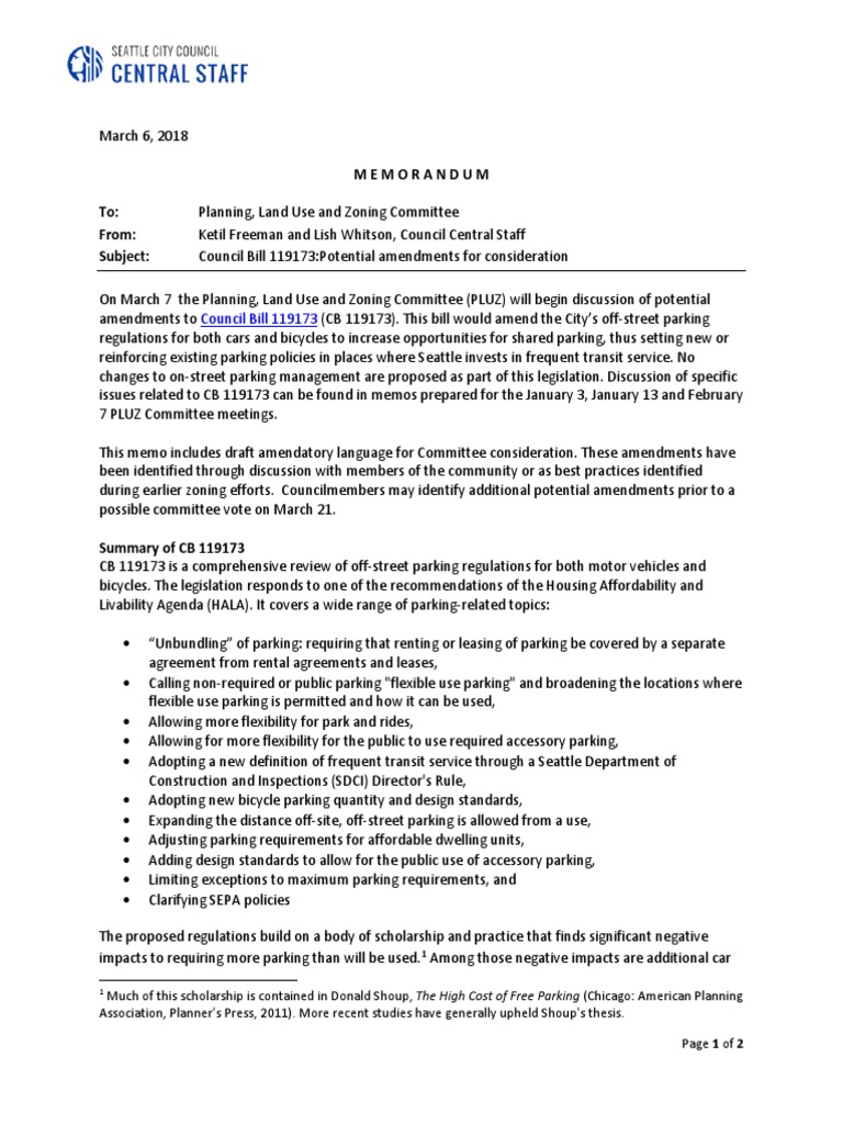 regulations for both cars and bicycles to increase opportunities for shared parking, thus setting new or reinforcing existing parking policies in places where Seattle invests in frequent transit service. No changes to on-street parking management are proposed as part of this legislation. Discussion of specific issues related to CB 119173 can be found in memos prepared for the January 3, January 13 and February 7 PLUZ Committee meetings. This memo includes draft amendatory language for Committee consideration. These amendments have been identified through discussion with members of the community or as best practices identified during earlier zoning efforts. Councilmembers may identify additional potential amendments prior to a possible committee vote on March 21.