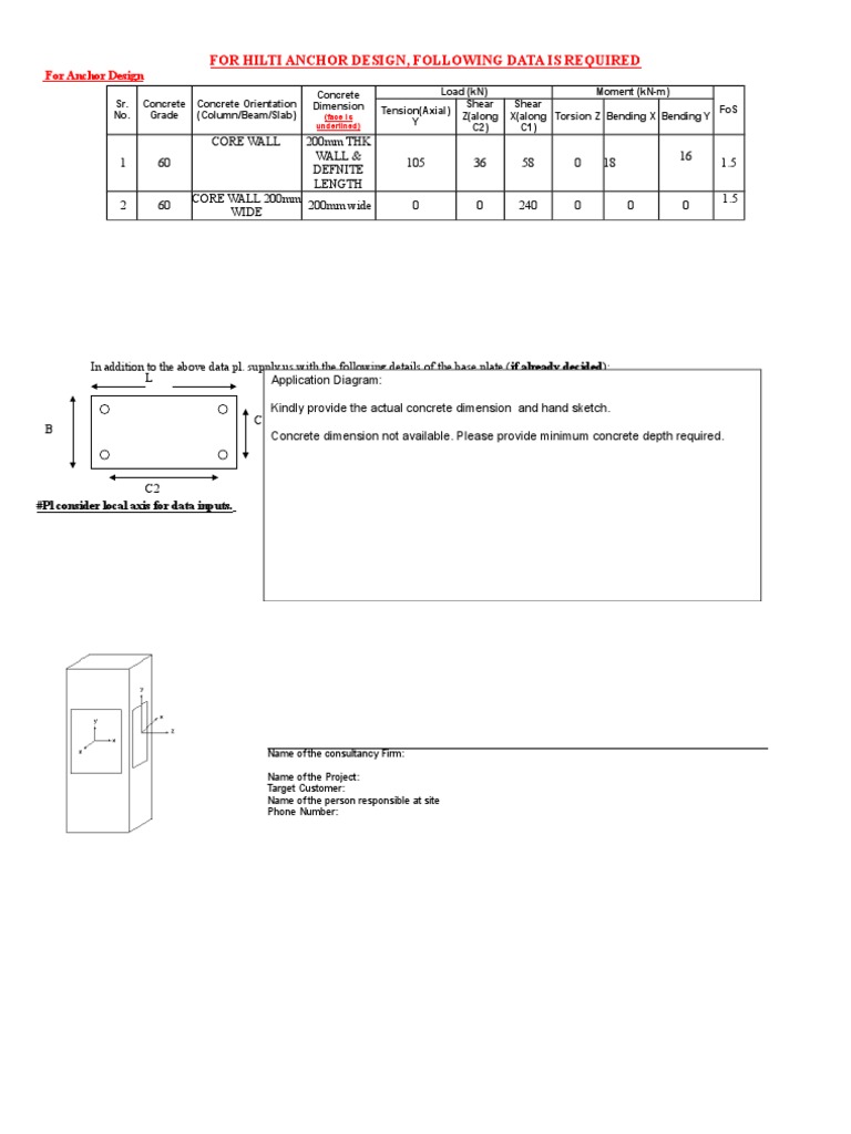 FOR HILTI ANCHOR DESIGN, FOLLOWING DATA IS REQUIRED