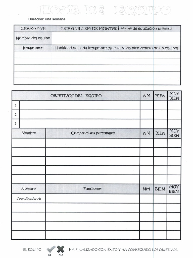 Primer hoja de equipo para crear y evaluar el trabajo en equipo. ACCA 4º de primaria, CEIP Guillem de Montgrí Curso 2017-18