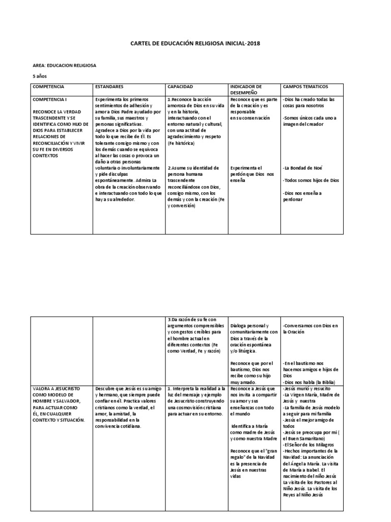 consigo personas voluntaria o mismo.Asume su identidad de persona CONTEXTOS equivoca al hacer las cosas o humana trascendente provoca un daño a otras reconciliándose con Dios.AREA: EDUCACION RELIGIOSA 3 años COMPETENCIA ESTANDARES CAPACIDAD INDICADOR DE CAMPOS TEMATICOS DESEMPEÑO COMPETENCIA I Experimenta los primeros 1. Fe y razón) . de agradecimiento y respeto (Fe DIOS PARA ESTABLECER Agradece a Dios por la vida histórica) RELACIONES DE por todo lo que recibe de Él. Admira La obra de la creación observando e interactuando con todo lo que hay a su 3. con los demás y con la involuntariamente y pide creación (Fe y conversión) disculpas espontáneamente. sus maestros y natural y cultural. con una actitud -Mi Ángel de la Guarda IDENTIFICA COMO HIJO DE personas significativas.Da razón de su fe con alrededor. como Verdad. argumentos comprensibles y con Descubre la oración -Nos comunicamos con Dios en gestos creíbles para el hombre como relación viva con la oración actual en diferentes contextos (Fe Dios Padre. la naturaleza -Dios nos ha creado para ayudar RECONOCE LA VERDAD amor a Dios Padre ayudado interactuando con el entorno a los demás TRASCENDENTE Y SE por su familia.Reconoce la acción amorosa de Descubre a Dios en -Dios nos crea por amor sentimientos de adhesión y Dios en su vida y en la historia. RECONCILIACIÓN Y VIVIR SU Es tolerante consigo mismo y FE EN DIVERSOS con los demás cuando se 2.
