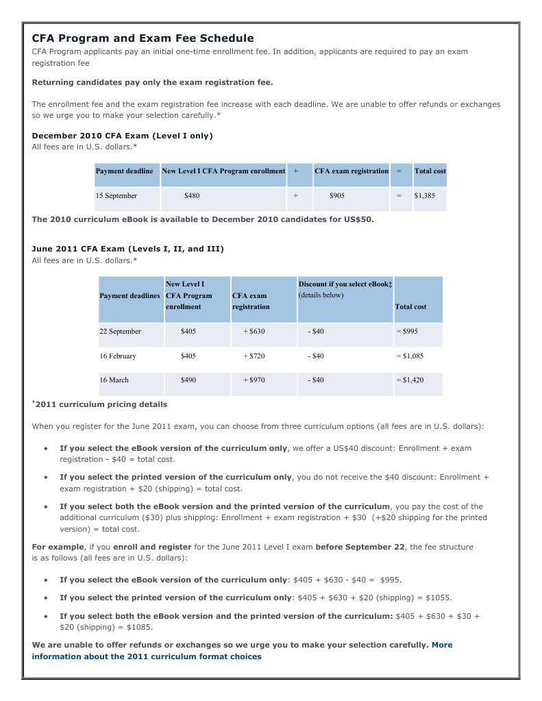 For example, if you enroll and register for the June 2011 Level I exam before September 22, the fee structure