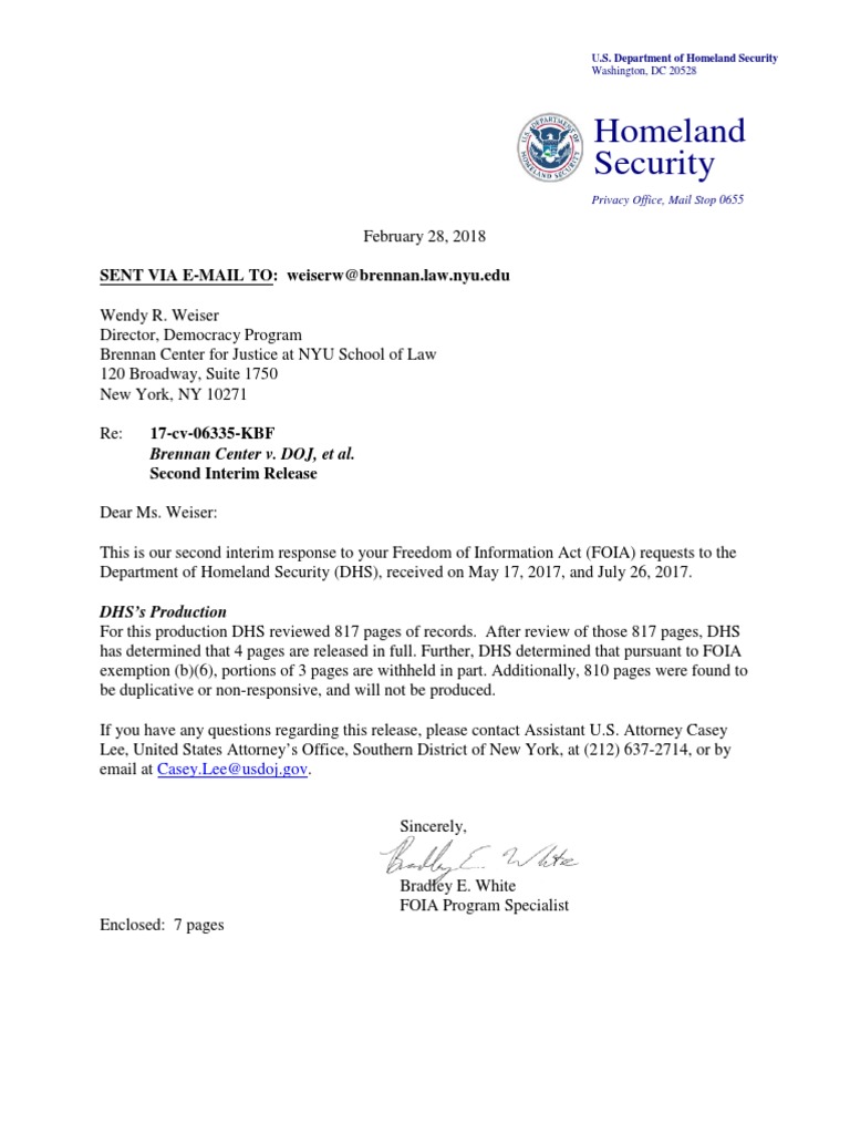 FOIA Response From DHS About The Presidential Advisory Commission On Election Integrity - February 28, 2018