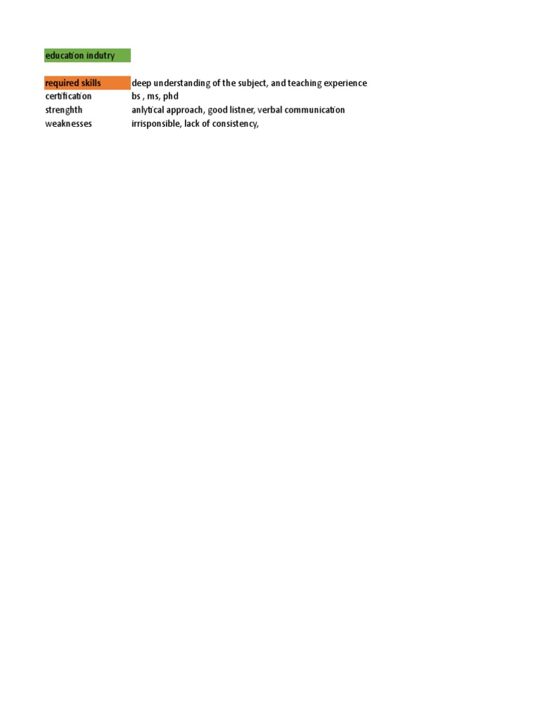 The document discusses required skills and qualifications for working in the education industry. It states that a deep understanding of the subject matter as well as teaching experience are required skills. It also notes that certifications like a BS, MS or PhD are needed. Strengths include having an analytical approach, being a good listener, and strong verbal communication abilities, while weaknesses can include being irresponsible or inconsistent.