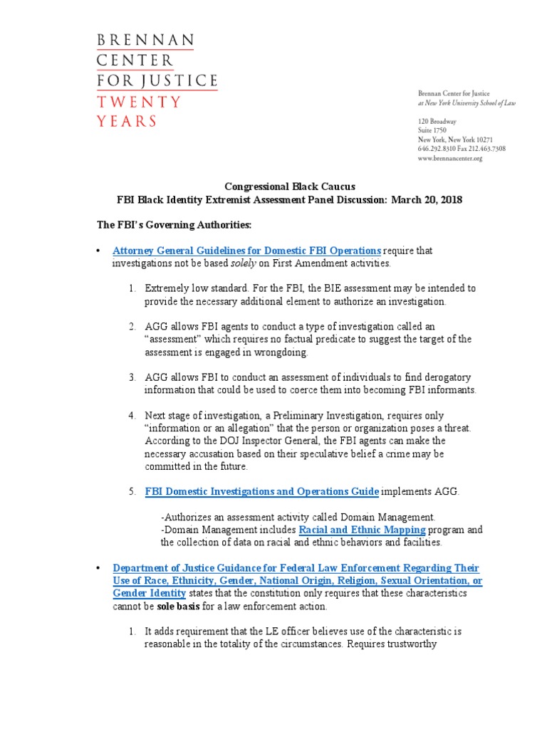 Fact Sheet: Michael German's Testimony Before The Congressional Black Caucus Concerning The FBI's "Black Identity Extremist" Assessment
