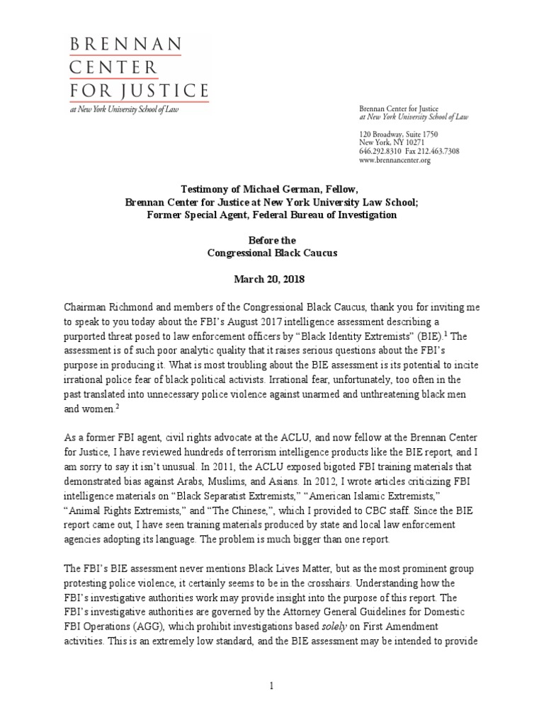 Full Statement: Michael German's Testimony Before The Congressional Black Caucus Concerning The FBI's "Black Identity Extremist" Assessment