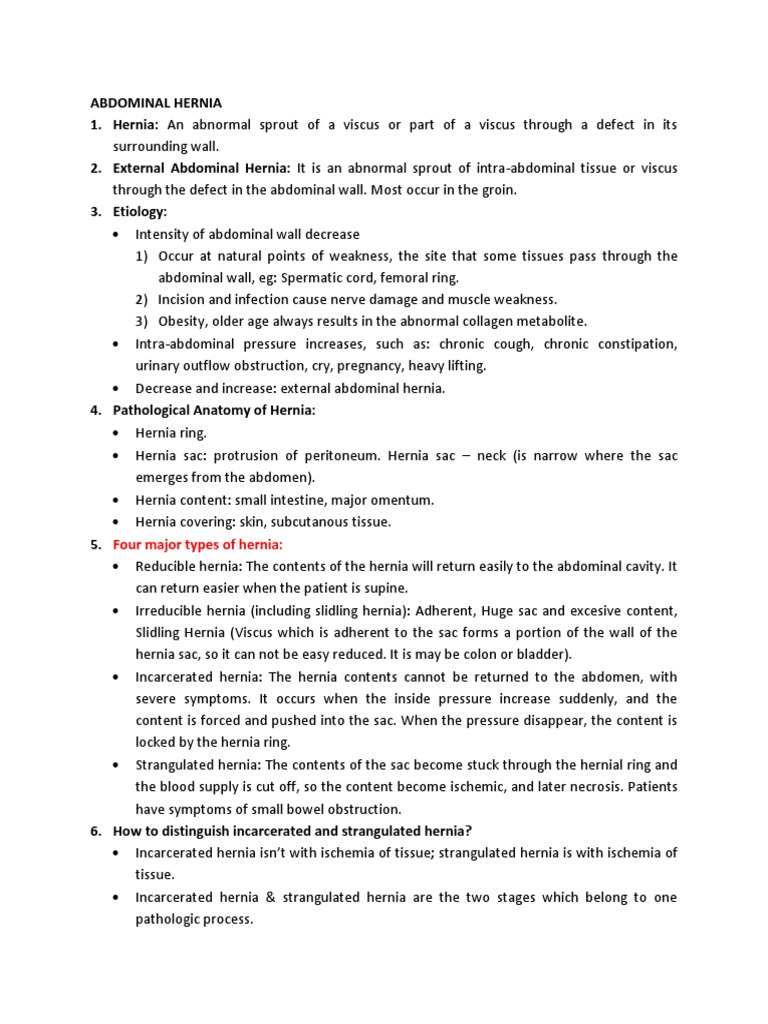 1. Hernia: An abnormal sprout of a viscus or part of a viscus through a defect in its
