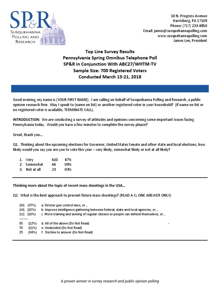 Methodology: This poll is conducted by Susquehanna Polling and Research, Inc1. Results to above questions were
