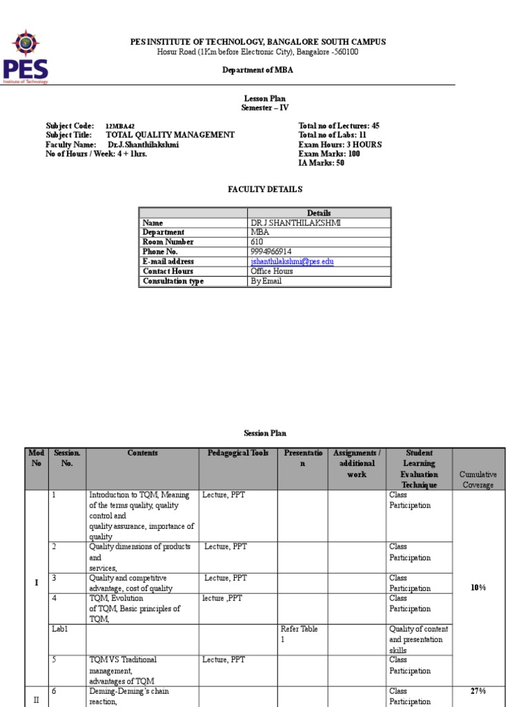 Subject Title: TOTAL QUALITY MANAGEMENT Total no of Labs: 11