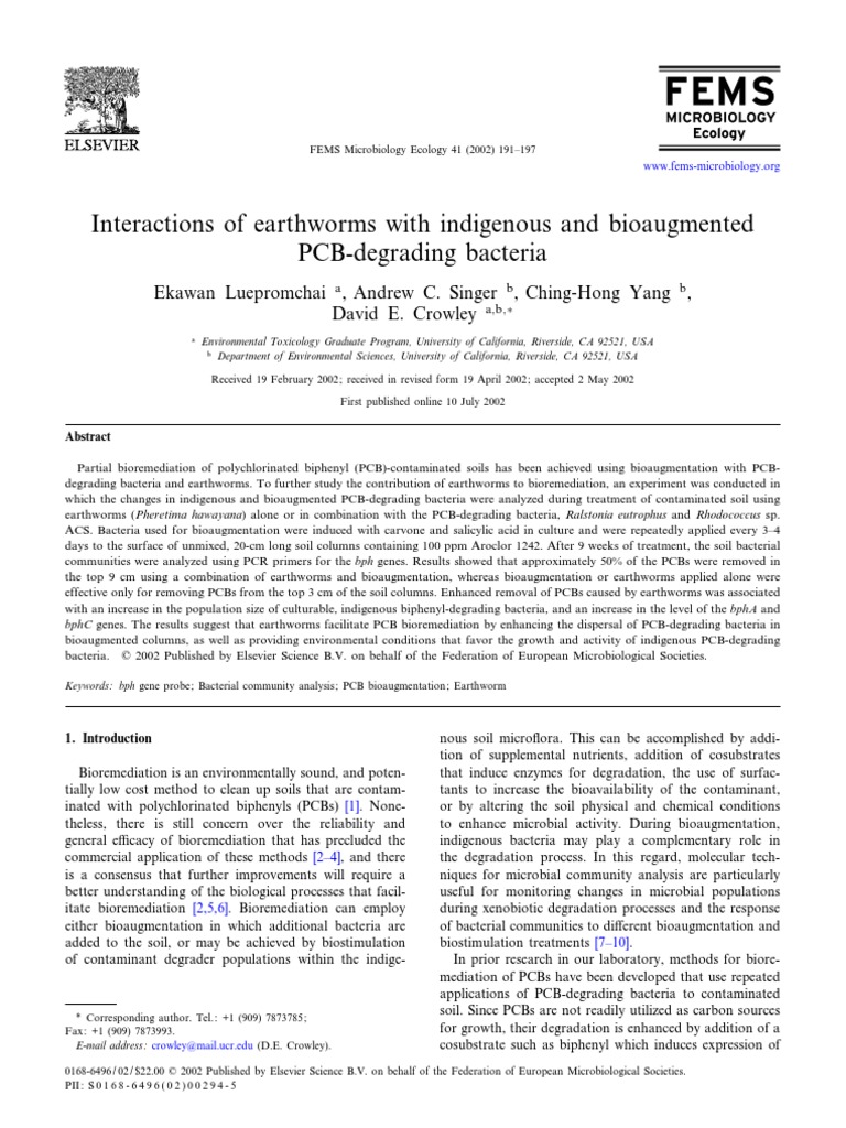 ley, D.E. (2001) Contribution of earthworms to PCB bioremediation. aerobic-aerobic biodegradation of PCBs in soil slurry microcosms.