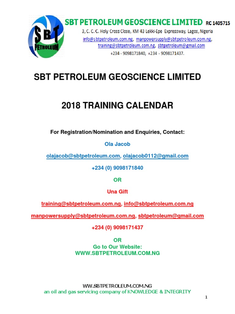 SBT PETROLEUM 2018 TRAINING CALENDAR