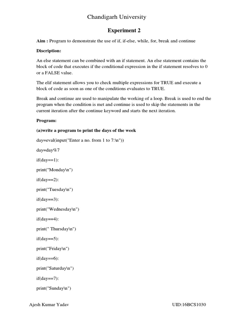 Aim : Program to demonstrate the use of if, if-else, while, for, break and continue