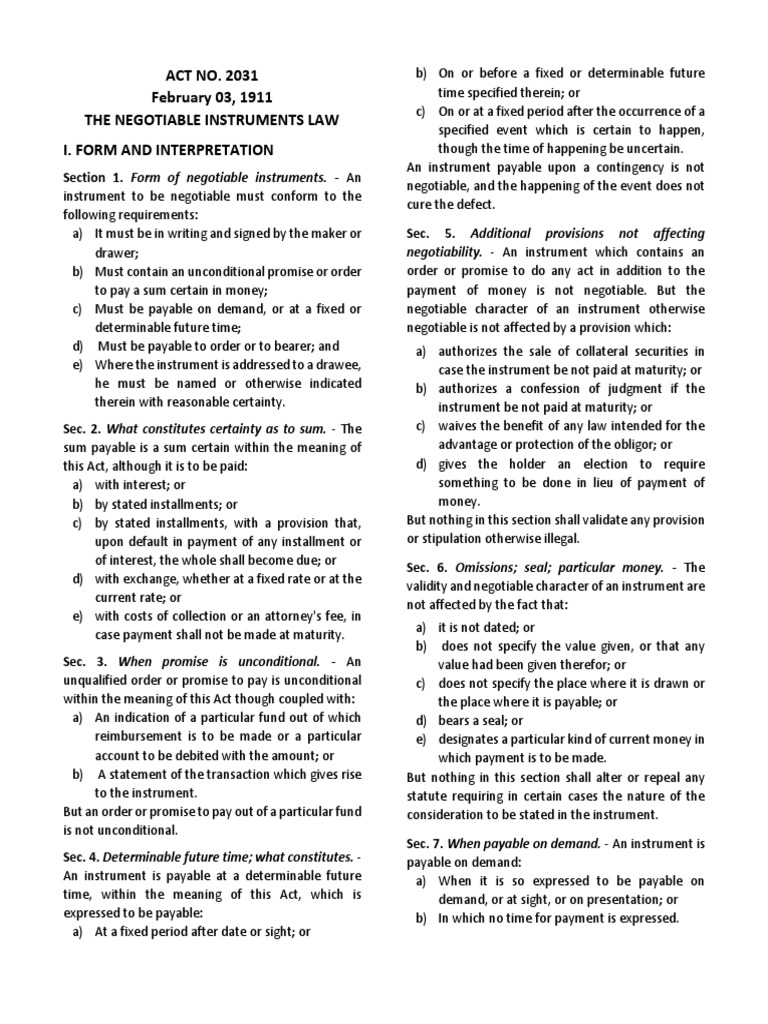 Negotiable Instruments Law Overview
