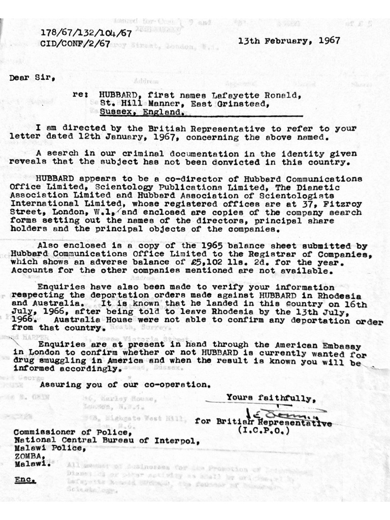 Scotland Yard replies to Malawi's inquiry about L. Ron Hubbard