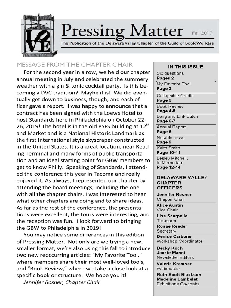 Page 4 Delaware Valley Chapter of the Guild of Book Workers PRESSING MATTER Fall 2017 Page 13 Delaware Valley Chapter of the Guild of Book Workers PRESSING MATTER Fall 2017